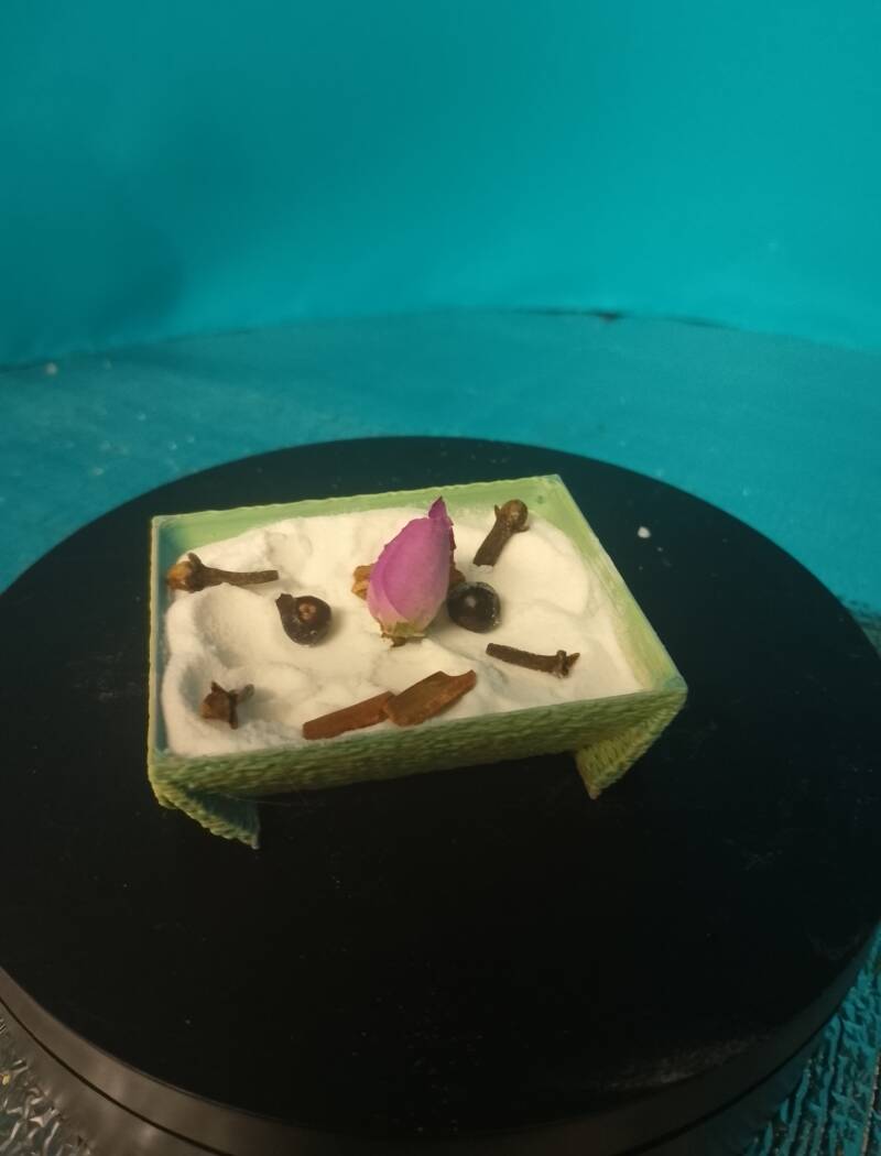 Zu sehen ist die Aromaschale Model01 mit Deko sowie unser Aroma-Duftwachs Rosenduft.